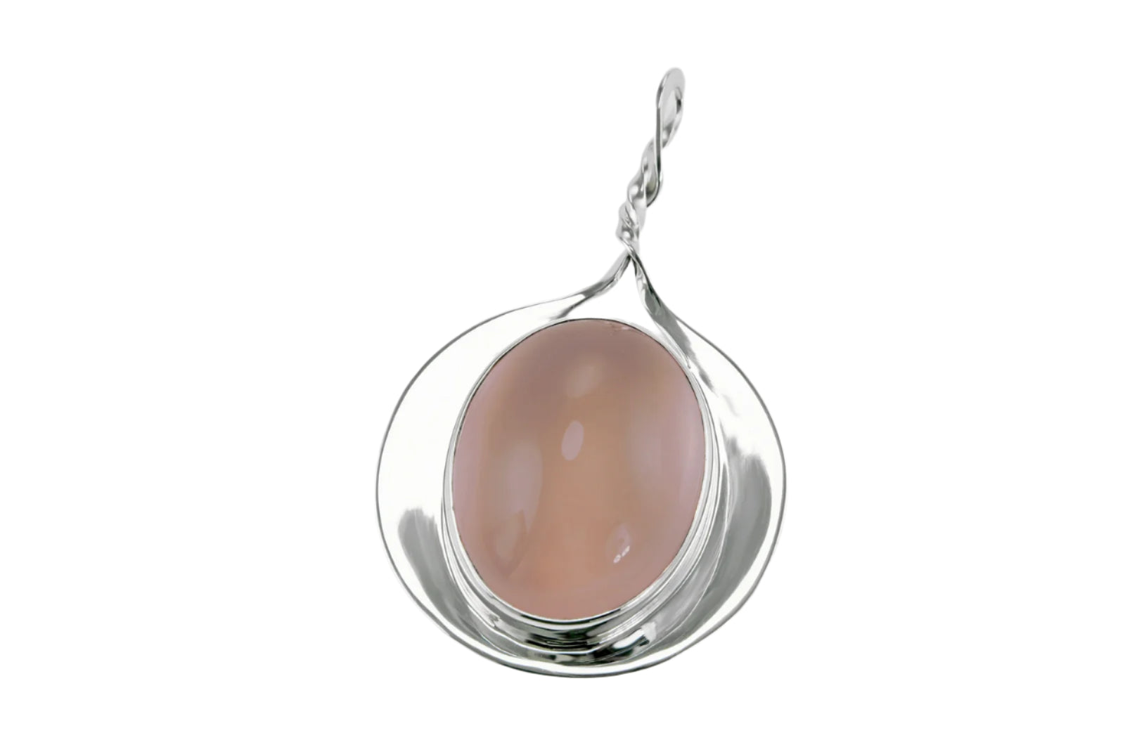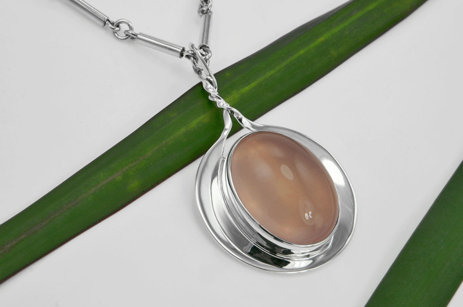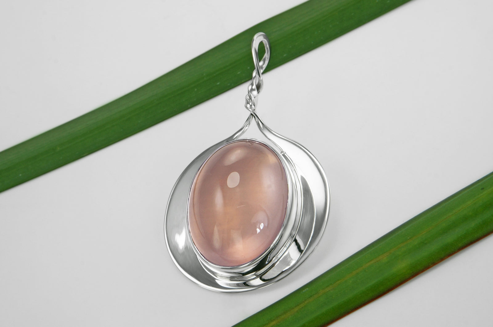Handgjort hängsmycke i rosenkvarts och återvunnet silver. Rosenkvarts sägs sprida kärlek, läkning och ro – egenskaper vi gärna omger oss med. Hänget är cirka 6 cm långt och passar bra på tubkedja eller en halsring. Väldigt vacker sten! One of a kind.