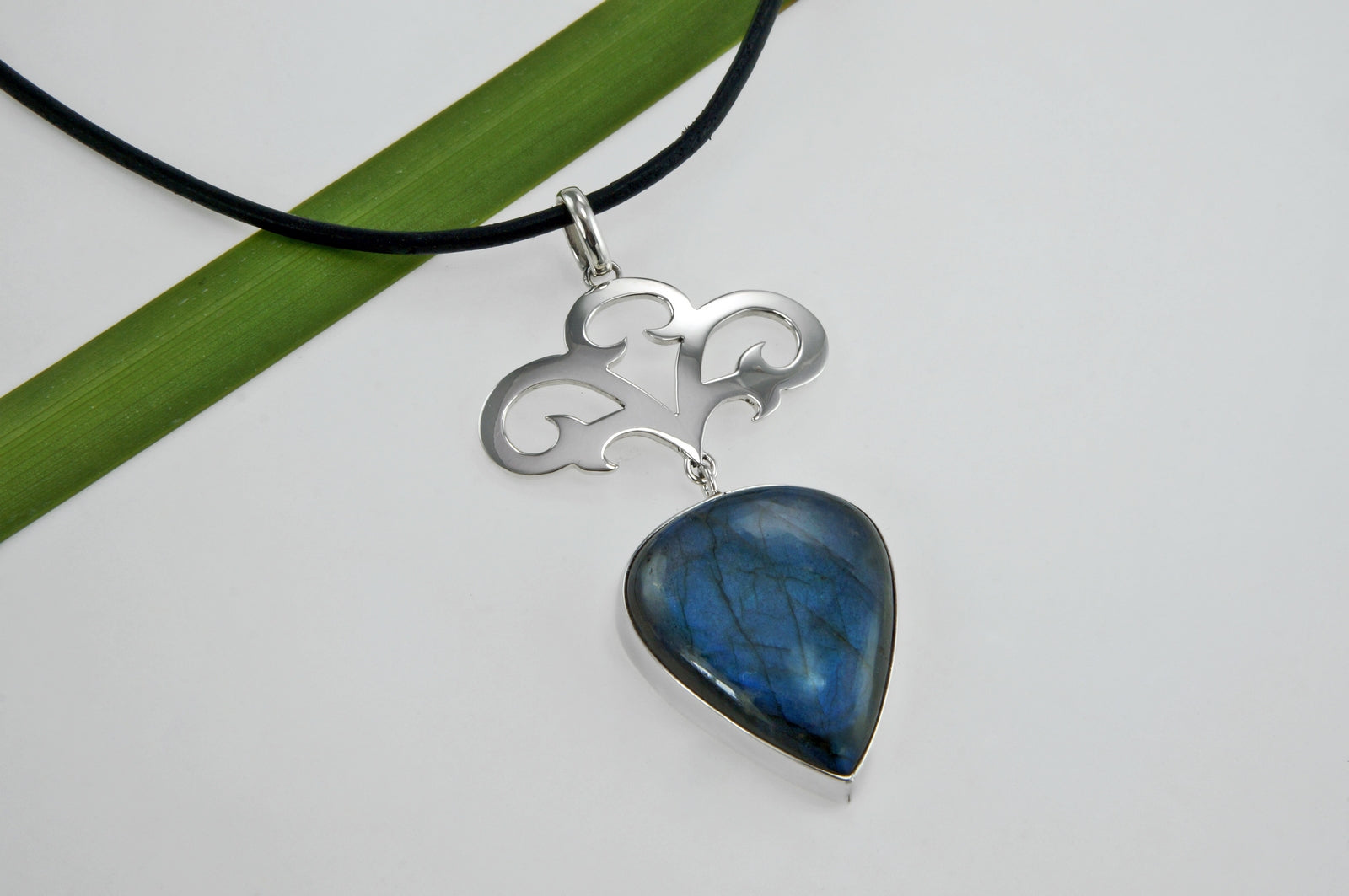 Silversmycket är inspirerat av snickarglädjen på Stenegård i Järvsö, och labradorit droppens färg påminner om de blånande bergen och älven. Silverhänget är handgjort i återvunnet silver och passar perfekt på en mockarem eller tubkedja. Smycket är cirka 7 cm långt.